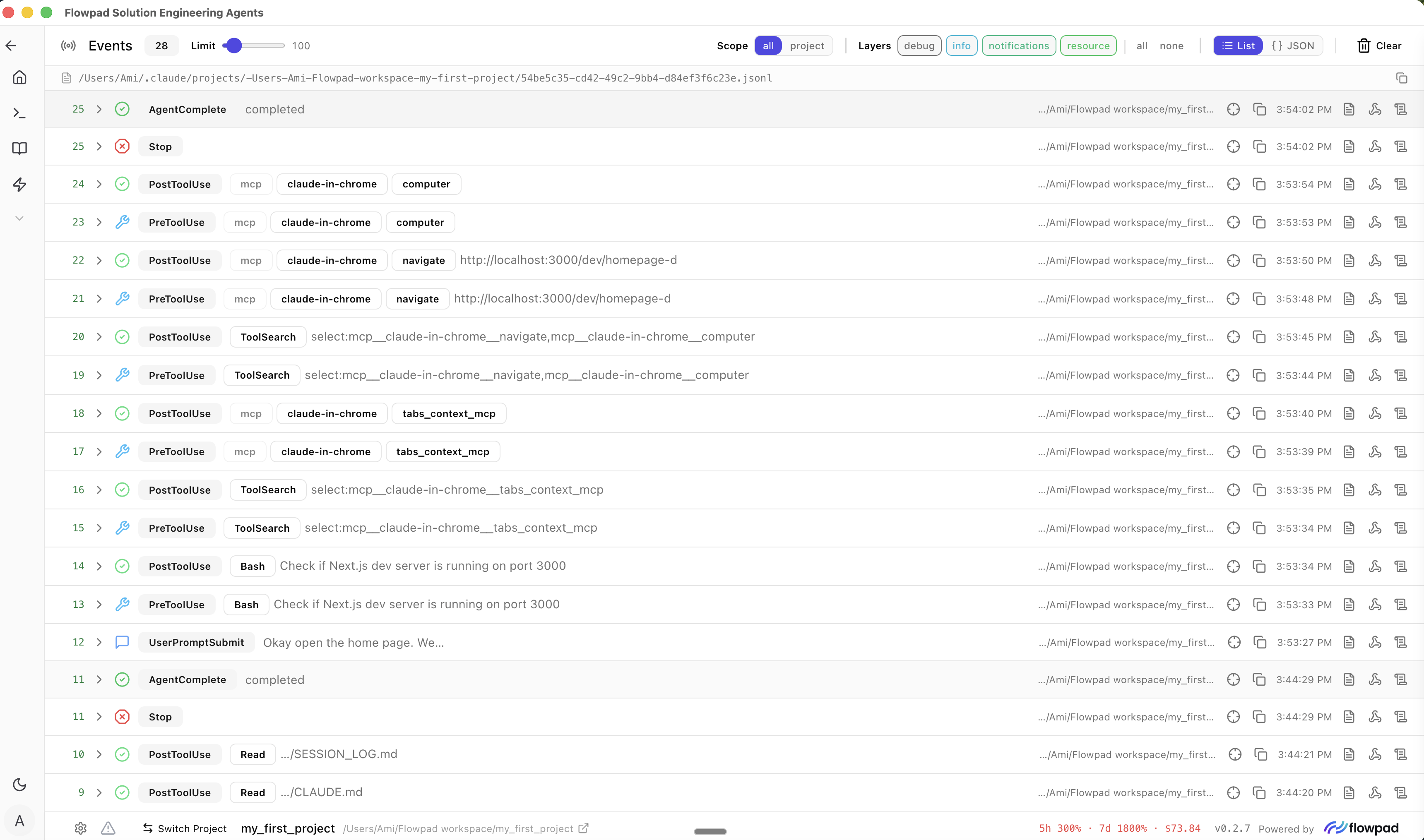 FlowPad reads your AI sessions and surfaces what's happening. Every tool call, every file change, every decision your agent made.